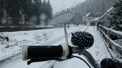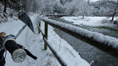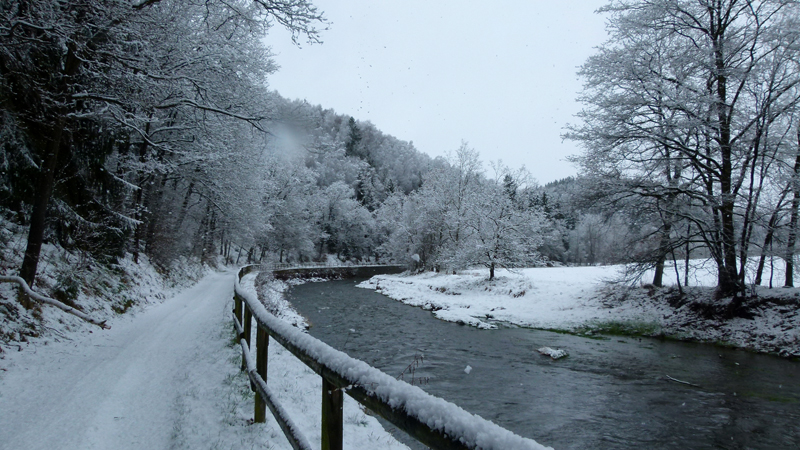 Kurvenreich folgt der Weg dem munter strömenden Fluss, ich radle durch den Winterwunderwald. Nur Fuchs und Hase haben diesen Weg heute vor mir nur benutzt, so verraten die Spuren im Schnee. Wo es taut, bilden sich riesige Pfützen - ich muss mitten hindurch. Ich hab ja eh schon einen nassen Schuh – vielleicht spüre ich die Nässe nicht mehr so, wenn nachher der andere auch aufgeweicht ist. Richt’ge Männer wie wir...