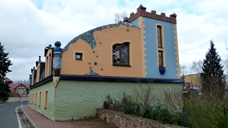 Endlich ein paar blaue Löcher am Himmel - und auch am Straßenrand taucht ein Farbtupfer auf - ein kleines Haus mit Turm und Zinnen, jedes Fenster ein Individuum, blaue Mosaiken zieren Kanten und Ecken, alles so schön verspielt, wie man es von der Stilistik eines berühmten Architekten kennt. Hundertwasser in Marschwitz an der Mulde? Die größte literarische Bedeutung jener von einer anderen Klitsche eingemeindeten Siedlung resultiert bisher wohl nur aus dem lokalen Busfahrplan. Vergeblich suche ich Informationen im Web. Vielleicht genießt der Besitzer das Mysterium um sein schmuckes Anwesen, zu dem auf der anderen Straßenseite auch eine adäquate Garage gehört. Der einzige Hinweis, den ich im Web finde: Die Hochwasserfluten vom August 2002 sollen vom ursprünglichen Haus nicht viel übrig gelassen haben – und so könnte das zerstörerische „Jahrhundertwasser“ die schöpferische Inspiration für ein Hundertwasser-Plagiat geworden sein...