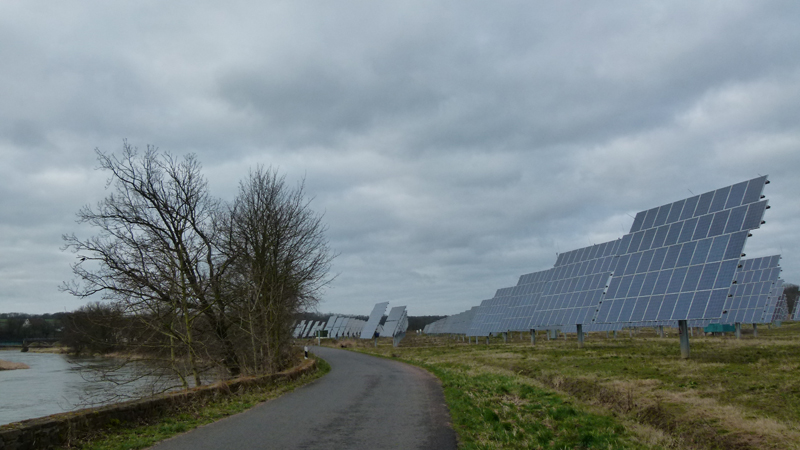 Die Phalanx aus meterhohen Photovoltaikwänden, die das Muldeufer bei Kössern verschandeln, ist noch im Standby-Modus - kein Sonnenstrahl kitzelt bisher die Solarzellen. Vor allem frage ich mich: Was wird damit bei der nächsten größeren Flut? Die Anlage steht auf einer tiefliegenden Wiese und am strömungsseitigen Ufer einer Flussbiegung! Aber gut, viel Zerstörung schafft dann temporär wieder einige Arbeitsplätze. Ich glaube, nach 25 Jahren Marktwirtschaft verstehe ich endlich, was der Stabü-Lehrer mit dem Grundwiderspruch des Kapitalismus gemeint haben könnte. Aber egal, dann wird einfach wieder in die Hände gespuckt, denn das steigert das Bruttosozialprodukt.