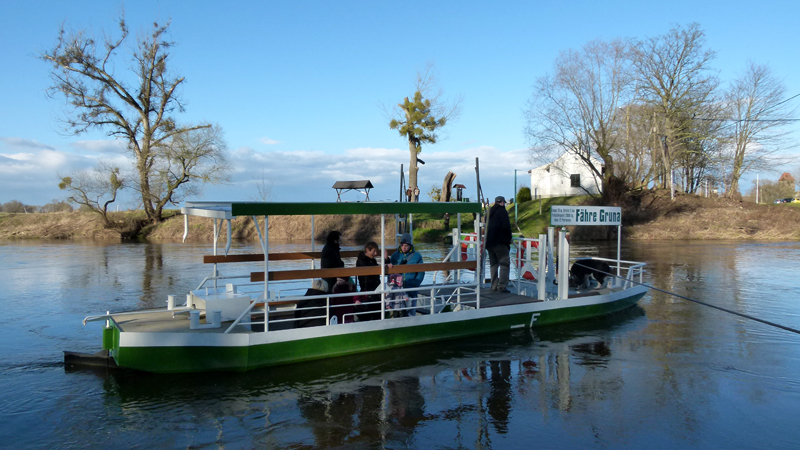 Zügig hinaus aus der Stadt und übers weite Feld, durch Wälder und Auen – und siehe da: Endlich setzt sich die Sonne durch! Ein Schild macht mich aufmerksam, dass die Fähre beim Dorf Gruna nur bis um sechs in Betrieb ist. Es ist Viertel nach fünf, ich überschlage, wie lange ich für die vier Kilometer brauchen werde. 20 Minuten, schätze ich, wenn die Strecke nicht gar zu holprig ist. Ich trete etwas kräftiger in die Pedale, um nicht zu spät anzukommen. An der Anlegestelle sehe ich schon von weitem einige Spaziergänger versammelt. Ich fahre direkt auf den schmalen Ponton und warte auf den Fährmann. Man müsse beim Haus erst auf einen Klingelknopf drücken, um ihn zu rufen, klärt mich eine Frau auf. Doch der Fährmann hat die Ansammlung schon bemerkt und kommt zur Fähre geradelt, sein Hund folgt ihm auf den Fuß.