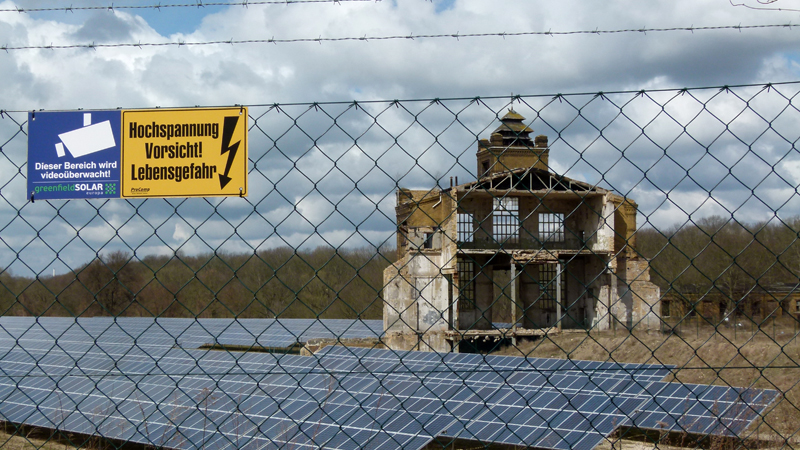 Vor Muldenstein schlängelt sich der Radweg durch ein Wäldchen, erst folge ich wildromantischen Wegen, dann treffe ich auf eine mit Maschen- und Stacheldraht umzäunte Lichtung. In die hat ein internationaler Energiekonzern „einen großen renditestarken Solarpark“ pflanzen lassen. „Greenfield Solar Global ist im Stande, Objekte aller Größenordnungen und Schwierigkeitsgrade schnell, professionell und in höchster Qualität anzugehen“, prahlt das Unternehmen auf seiner Website.“ Toll, was die so drauf haben! Die landschaftsgestalterische Integration abrissreifer Altlasten gehört offensichtlich auch dazu...