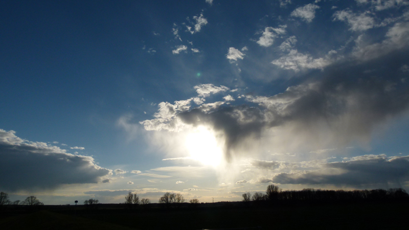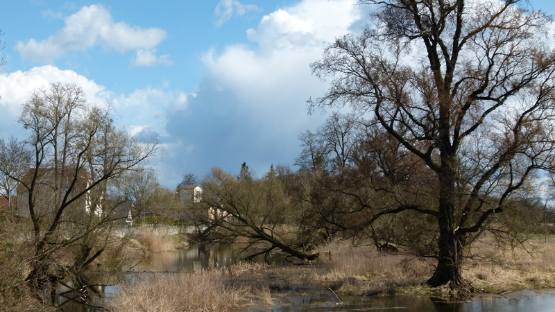 Ein Blick zum Himmel stimmt mich optimistisch. Ich stelle mich auf sonnige letzte Kilometer bis zu meinem Quartier ein. Doch auf dem freien Feld zwischen Westewitz und Klosterbuch verdunkelt sich der Horizont, rasch sinkt die Temperatur und nur Minuten später wird die Osterspazierfahrt nochmals schaurig: Ohnmächtige Schauer körnigen Eises hängen aus grauen Wolkenschleiern herab, sie ziehen in Streifen über die grünende Flur – mir entgegen und mit aller Wucht ins Gesicht. Dem eisigen Wind biete ich die Stirn, doch dann peitschen mir Sturmböen mit Graupel ins Gesicht, ich muss mich abwenden, muss stehenbleiben, mich auf den Beinen halten, bis es vorbei ist.