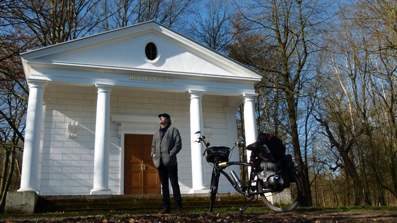 Der Name des realen Fürsten, der sich 1777 hier ein den Geschmack der Zeit befriedigendes Gartenhäuschen in die Flur stellen ließ, war Leopold III. Friedrich Franz, Fürst und Herzog von Anhalt-Dessau, ein Enkel des alten Dessauers. Fürst Franz, ganz untertänigst auch Vater Franz genannt, war ein Kind der Aufklärung. Mit seinem Reformgeist brachte er dem Land wirtschaftlichen Aufschwung, sagt das Geschichtsbuch, mit der Zahlung von Kontributionen (Erpressungsgeld) an Preußen ersparte er seinen Untertanen, gegen die Armee des königlichen Haudegens von Sanssouci anzutreten. Zur Begleichung der Forderungen des alten Fritzen griif Franz angeblich nur in seine private Sparbüchse, offenbar blieb ihm noch etwas Geld für so manches gärtnerische Anwesen - am bekanntesten ist der Wörlitzer Schlosspark. Doch hier, ein paar Meilen vor Wörlitz, an einem Waldweg versteckt, erstrahlt in frischem Weiß die einstige Gartenlaube des Fürsten - mit ihrer güldenen Widmung: Der Besserung.