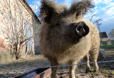 Das mit dem Reiterhof sei schon Jahre vorbei, sagt die Wirtin, die mich durch den Viersaitenhof aus dem 18. Jahrhundert führt. Wer aber mit dem borstigen "Streichelzoo" vorlieb nehmen kann, findet auch seine Kurzweil. Doch Vorsicht ist geboten! So eine eierlegende Wollmichsau kann beißen wie ein Wildschwein. Der elektrische Draht möge sie von meinen strammen Radlerwaden fernhalten. Letztere hatten gerade eben die kribbelige Bekanntschaft mit dem Draht gemacht - das zeugt davon, dass hier nicht nur Placebo-Strom anliegt.