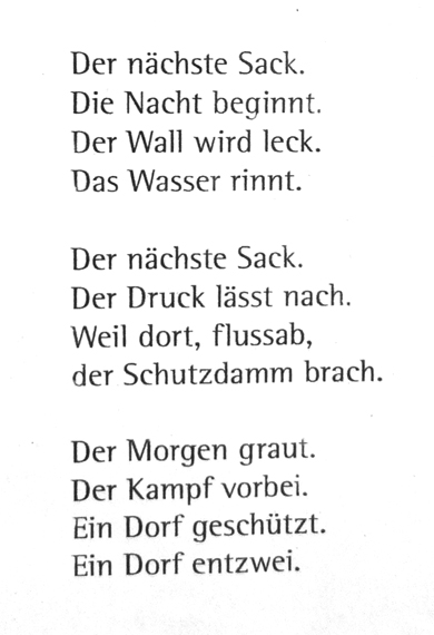 Seit 2007 soll ein erhöhter Deich ums Dorf dafür sorgen, dass jede Kuh im Dorf trockene Füße behällt. Als im Juni 2013 die erste Bewährungsprobe überstanden war, titelte eine Zeitung: "Ringdeich bestand sein Feuertaufe"... Was der Titel wie der dazu gehörige Artikel verschweigen, ist die Tatsache, dass der Deich zu lecken begann und Schlimmeres wahrscheinlich nur durch die Entlastung infolge eines anderen Dammbruchs vermieden wurde. Das zumindest legen die letzten drei Strophen eines Gedichtes nahe, deren Verfasserin Stefanie Robrecht heißt.