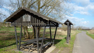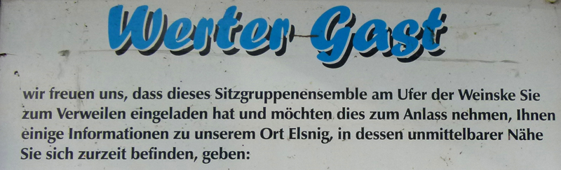 Was für eine herrlich ruhige Nacht das war! Und zum Frühstück habe ich ein ganzes Büffett für mich allein. Der Wirt bittet mich, sein neues Gästebuch einzuweihen: Aber nur Positives! - Klar, mach ich gern. Der Himmel ist heiter, auf zur letzten Etappe. Nach höchstens einer Meile lädt ein einmaliges "Sitzgruppenensemble" zum Verweilen ein - und eine Infotafel zur Schließung bestehender Bildungslücken über Elsnig.