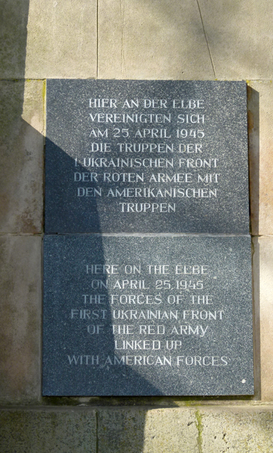 Da begegnen sich also Anfang April 2015, nahe am 70. Jahrestag der historischen Begegnung der Weltkriegsalliierten, zwei jungendliche deutsche Radwanderer, einer gut unter 20, der andere gut unter 60, in unmittelbarer Nähe des nicht minder historischen Denkmals - und werden sich einig, dass Stiefel, die für Soldaten in matschigen Schlachtfeldern geschustert wurden, für Radler auf nassen Radtouren nicht weniger geeignet sind.