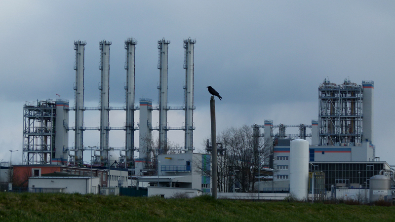 Nach der nächsten Flussbiegung verschandeln die Chemiewerke von Nünchritz den Horizont. Das Gewirr aus Rohren, Schornsteinen und Silos ragt in den grauen, regenschweren Himmel. Ein Rabe kontrolliert das Revier. Der "größte Chemiearbeitgeber Sachsens" ist auf 1400 Arbeitsplätze stolz. Und was produzieren die Glücklichen während der ihnen gegebenen Arbeit?