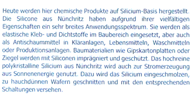 Produkte auf Silicon-Basis, verrät mir die Infotafel, als elastische Kleb- und Dichtstoffe im Baubereich verwendbar, klar, wo sonst. Aber auch als Antischaummittel in Kläranlagen, Lebensmitteln, Waschmitteln... MOMENT mal! Habe ich da eben gelesen: in Lebensmitteln? Hääää??? - Was haben Antischaummittel auf Silicon-Basis in Lebensmitteln zu suchen? Was muss da, verdammt noch mal, entschäumt werden?