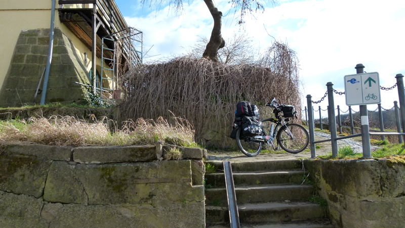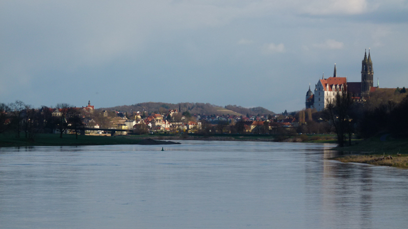 Am Ende des Tunnels, nein, am Ende des Horizontes ist Licht. Die Silhouette von Meißen schimmert im tiefen Winkel der letzten Sonnenstrahlen. Die erste Brücke ist schon zu sehen, bald habe ich sie unterquert. Doch an der zweiten scheitere ich, denn der Radweg ist von der Elbe geflutet. Es gibt demnach zwei Optionen, drüber oder drunter. Eine steile Treppe führt zur Brücke hinauf. Ohne Hilfe nicht zu schaffen - trotz der Fahrradschiene: keine Chance. Ein Pärchen mit Kind quält sich langsam die Stufen herunter. Der Vati sieht eher nicht so aus, als hätte er danach noch Lust, mir aufwärts zu helfen - zumal er sich zur Belohnung für den anstrengenden Abstieg gerade eine Zigarette anzündet. Zweite Option: Unter der Brücke durch, also durchs Wasser fahren, und sei's mit nassen Schuhen. - Ein prüfender Blick, doch in der Kurve ist nicht zu erkennen, wie es hinter der Brücke weitergeht. Nachher hab' ich nasse Füße und komme trotzdem nicht weiter? Nee! Muss nicht sein. Ich fahre wieder 500 Meter zurück, schiebe eine leichte Steigung hinauf, radle durch schmale Gassen, erreiche die Brücke von oben her und biege zum Bahnhof ab.