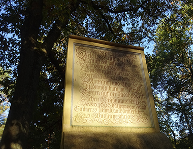 Da es im Beeskower Hotel zum Schwan schon ab 7 Uhr Frühstück gab, kann es zeitig in die Pedalen gehen. Meine himmliche Freundin, Frau Komoot, führt mich zunächst durch Felder und Wälder. Die Kutschen von Königen und anderen erlauchten Jägersleuten waren auf den geplasterten Wegen, die mich und meine Sänfte gerade durchschütteln, schon unterwegs gewesen. Kompanien preußischer Soldaten ebenso ein kurfürstlicher Jäger. Anno 1696 soll er hier einen so kolossalen Hirsch erlegt haben, dass der einstige Kurfürst und spätere erste Preußenkönig Friedrich seine Ruhmestat standesgemäß verewigen ließ - also mit einem einige Meter hohen Gedenkstein, damit der Rest der Welt weiß, wer hier einst einen 66-Ender mit eigenen Händen geschossen...
