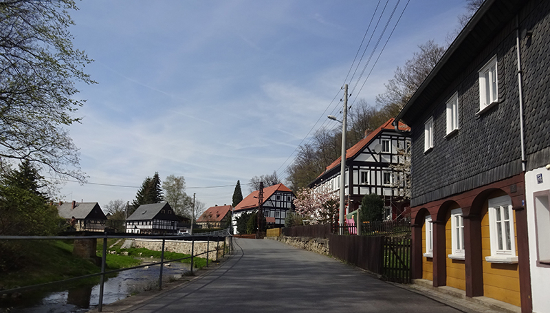 Um die Bekanntschaft mit abbrechenden Ästen zu vermeiden, ändere ich meine Strecke - statt durch die Wälder im Grenzgebiet radle ich besser die Straße nach Rosenthal. Über Langenhennersdorf und Kuckuckstein gelange ich in ein Tal, durch das die Gottleuba plätschert.